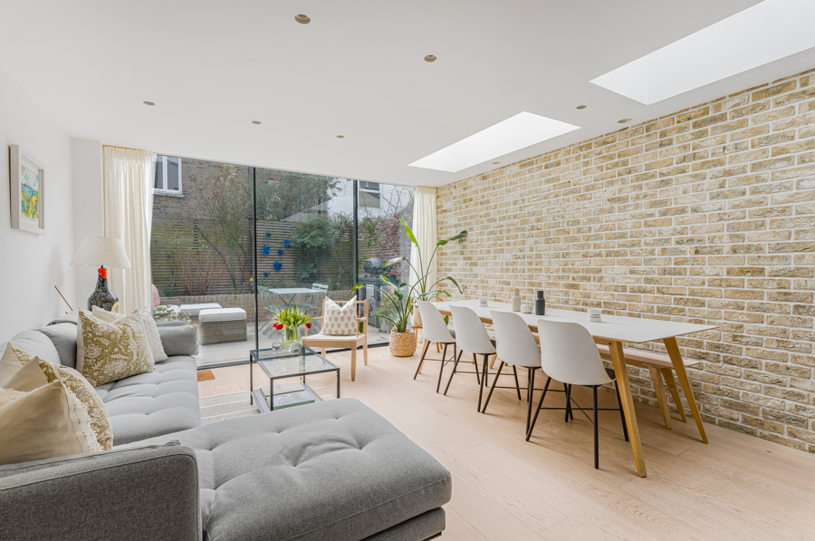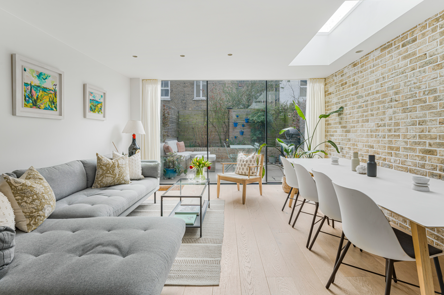 The heart of the property is a stunning open-plan kitchen and living space featuring beautiful exposed brickwork and floor-to-ceiling doors that open directly onto a generous patio perfect for indoor and outdoor living and entertaining. The south-facing garden ensures the home is flooded with natural light throughout the day.