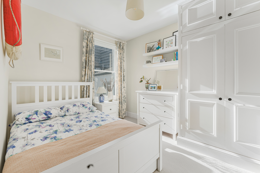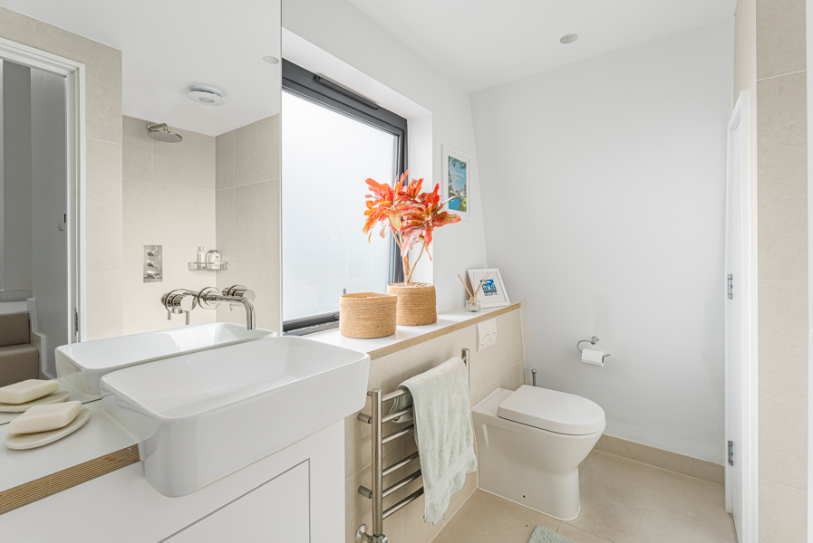 Across the first and second floors are four well-proportioned double bedrooms, all with built-in storage. Two modern bathrooms serve the upper levels, offering comfort and convenience for family living.