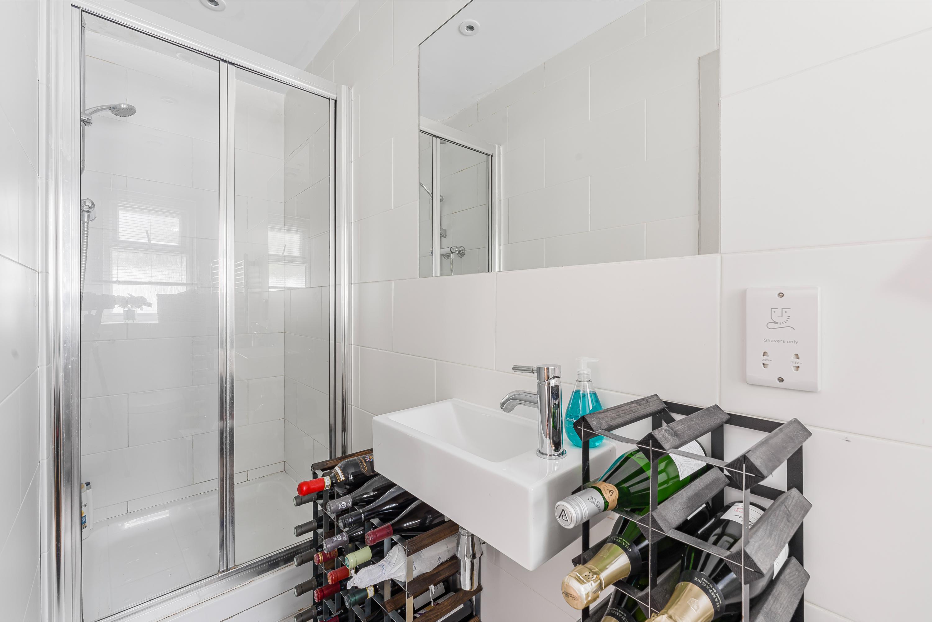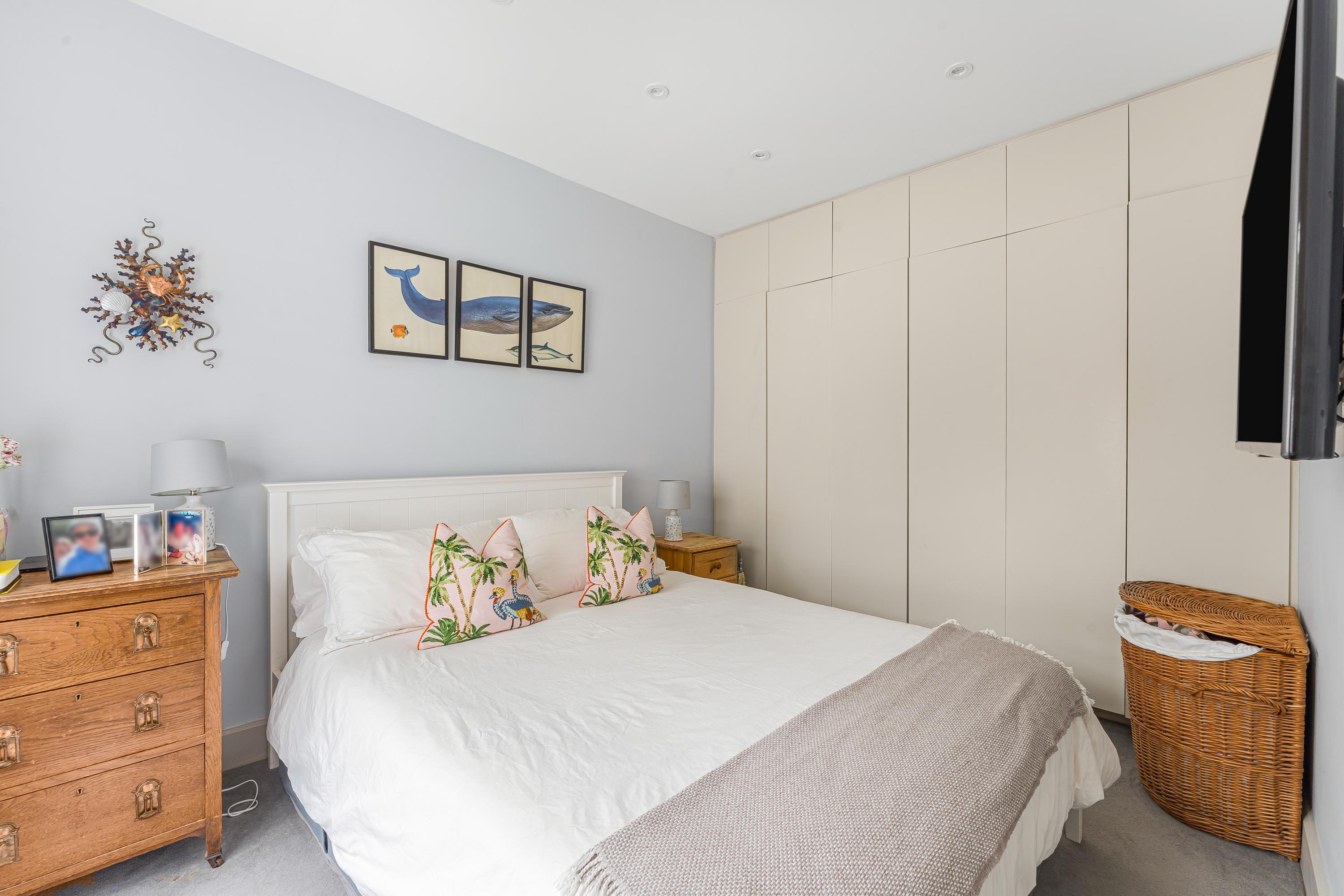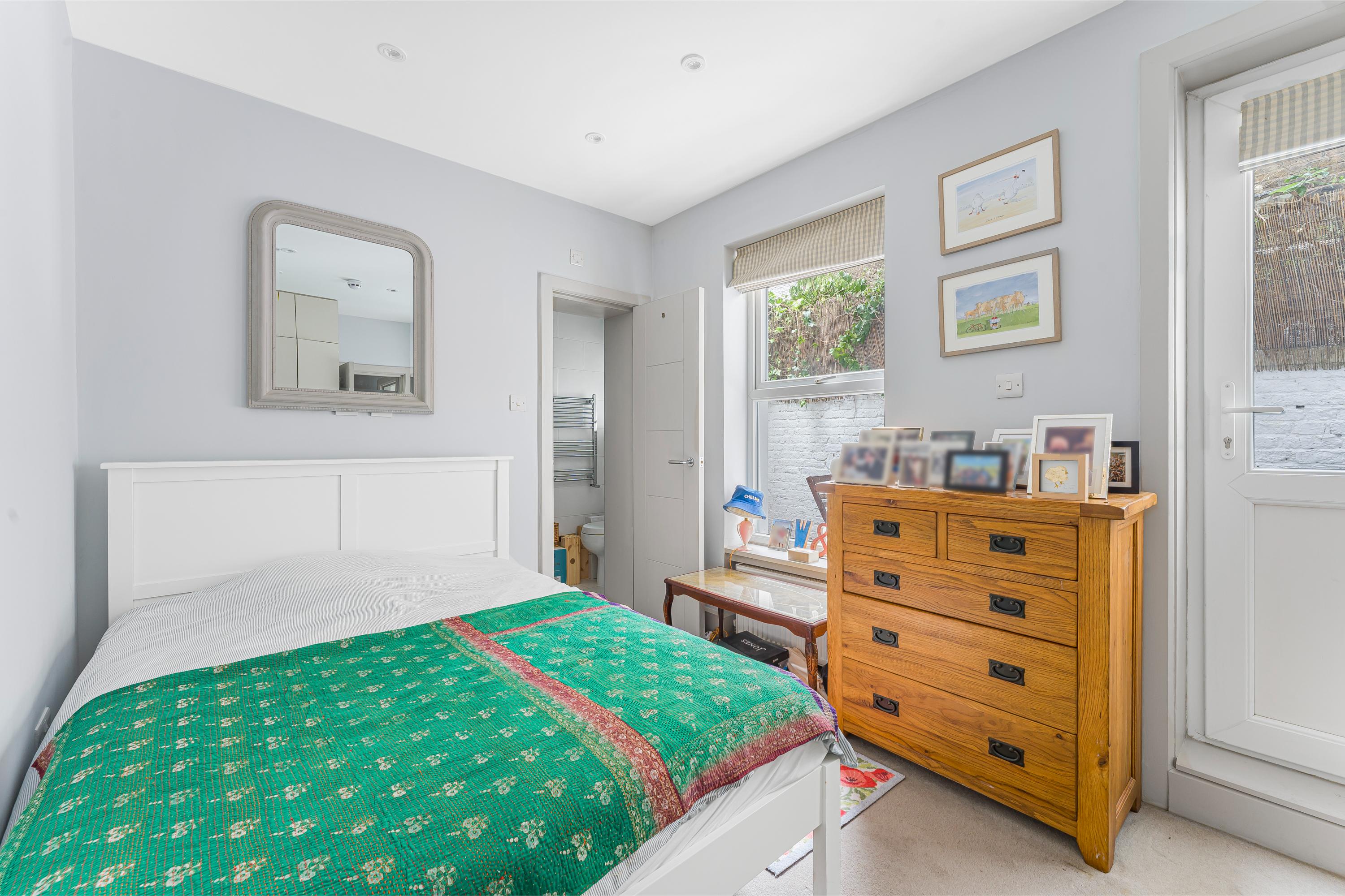 To the rear, the principal bedroom is a generous double with direct access to the private garden and an en-suite shower room. A second double bedroom with fitted storage sits centrally, also overlooking the garden, and is served by a contemporary family bathroom.