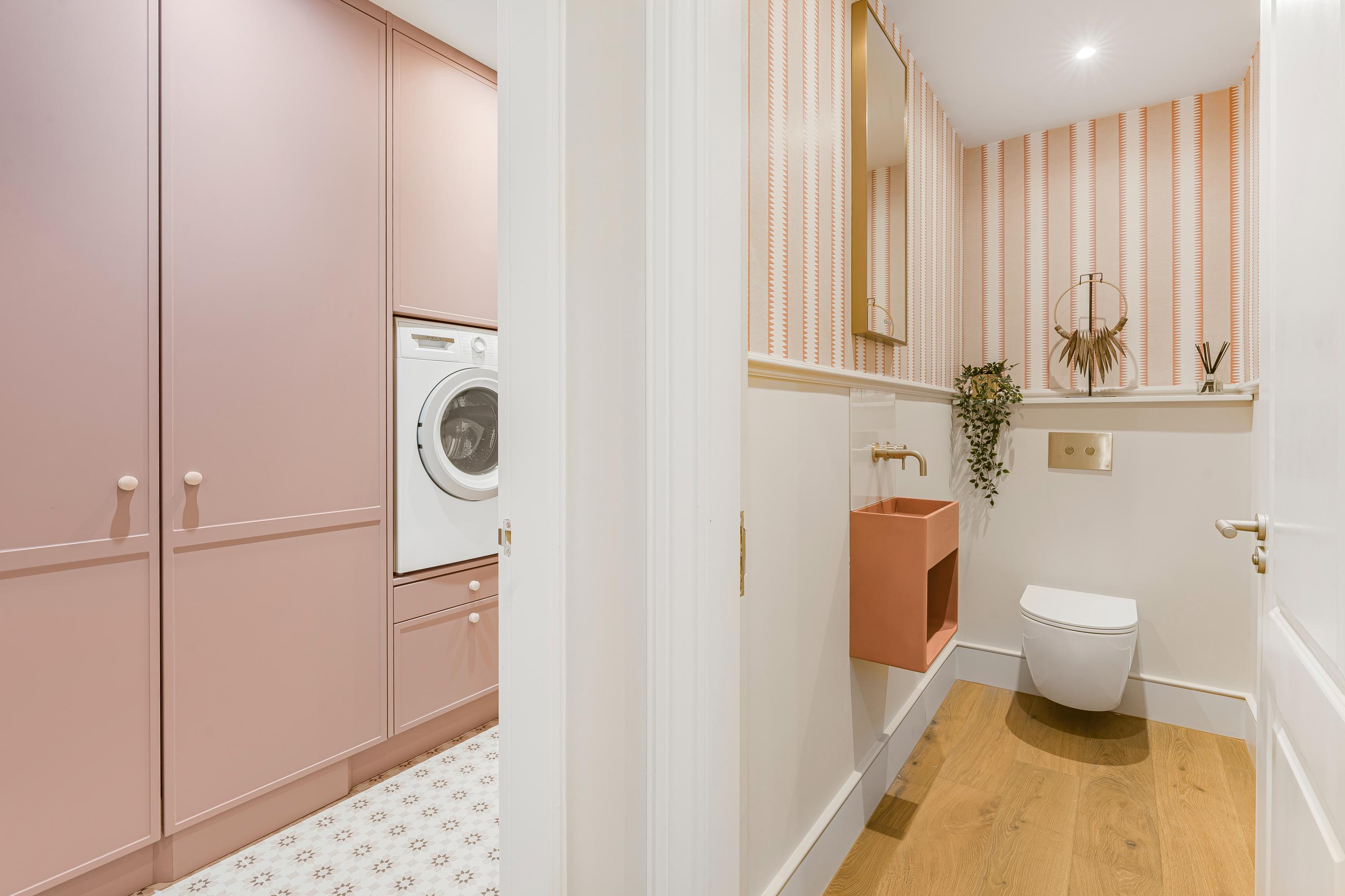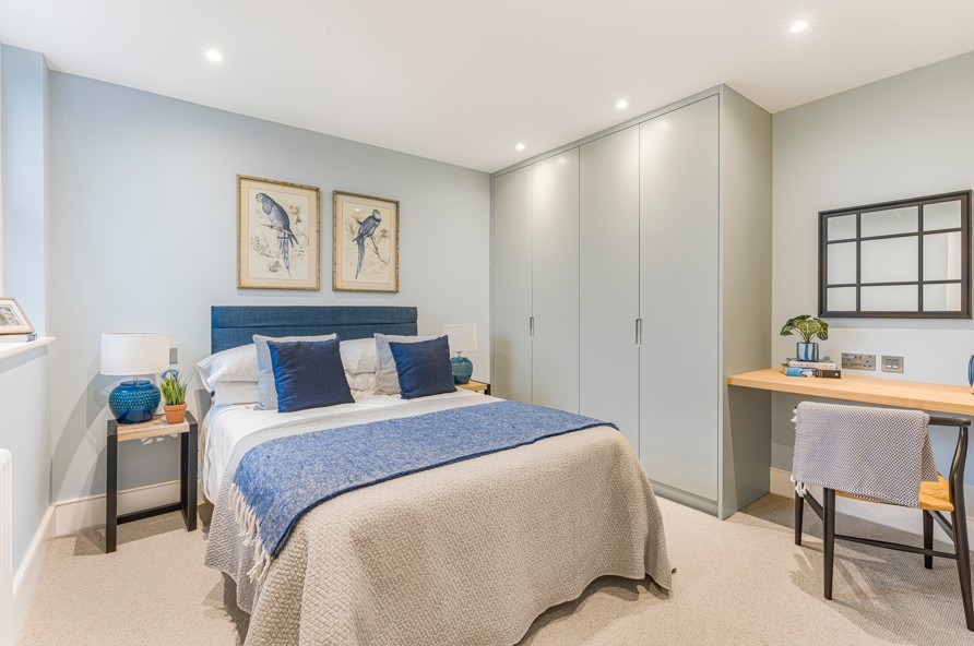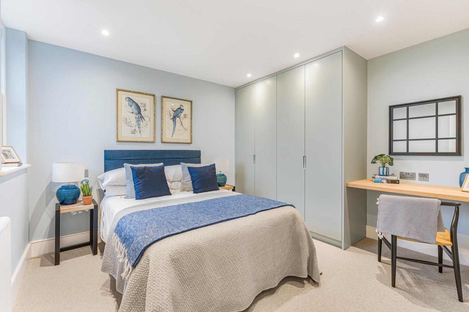 The principal suite occupies the first floor and provides extensive built-in storage, a spacious en suite bathroom, and access to a private balcony. The second bedroom on this floor is also generously proportioned.