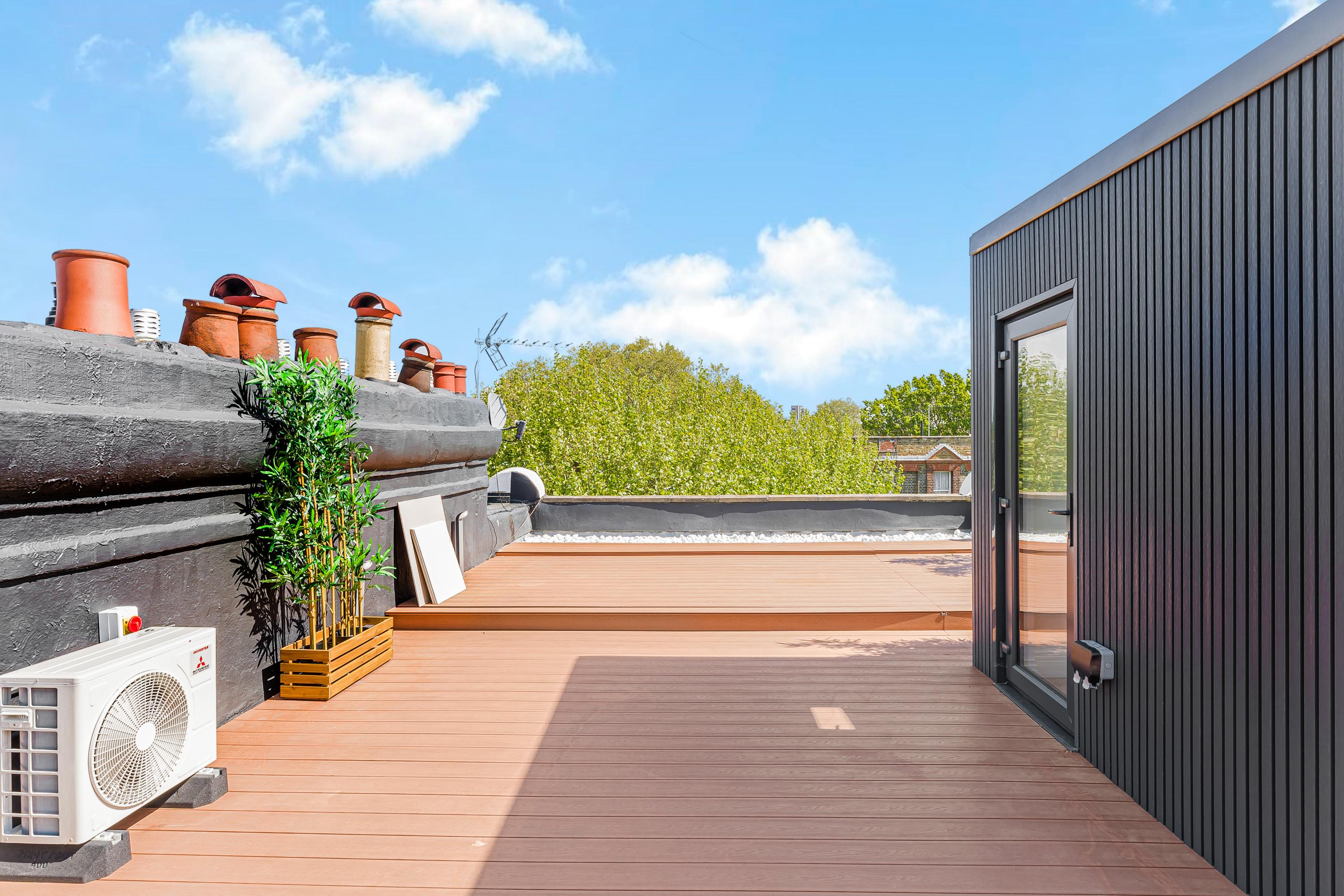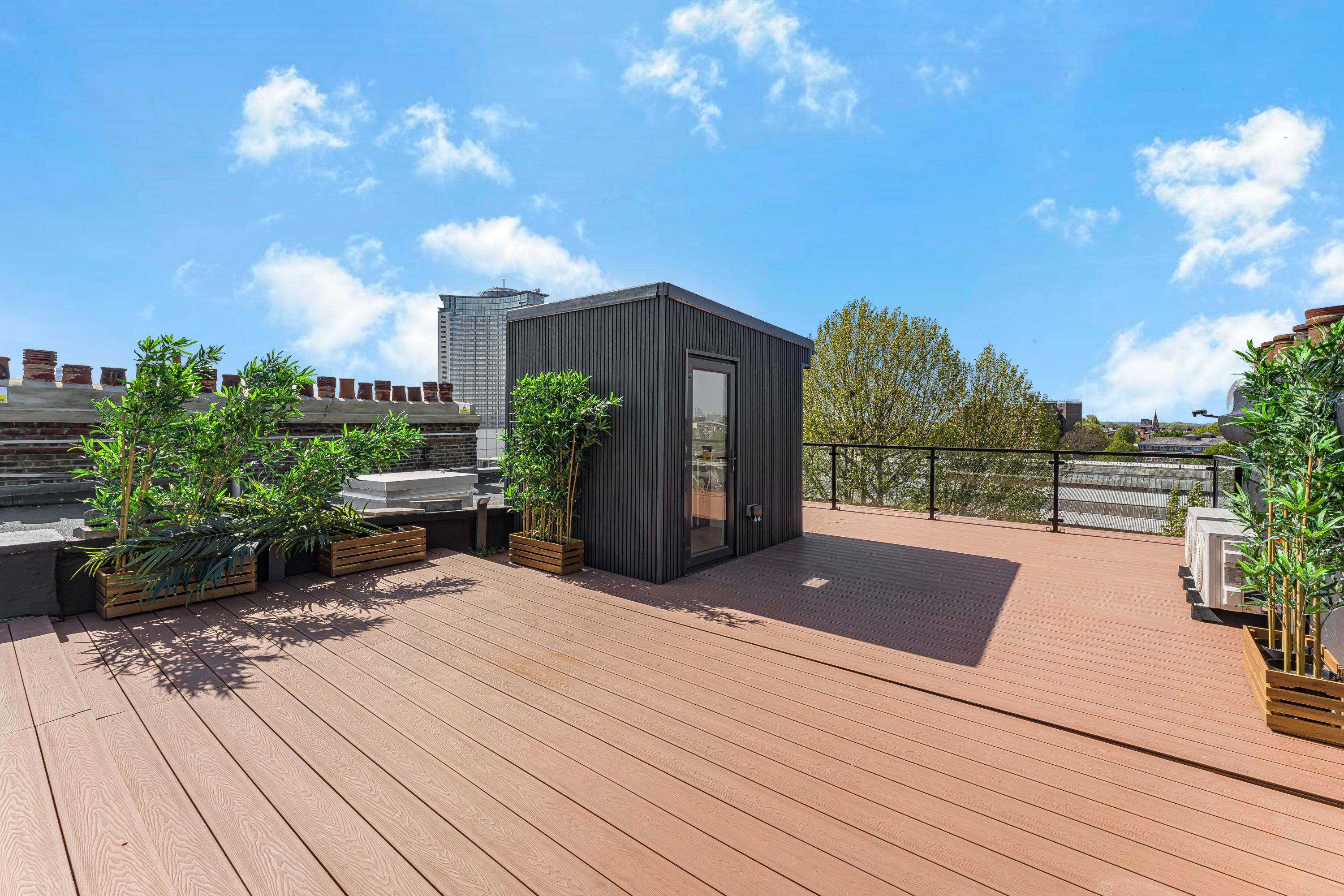 The property benefits from excellent natural light and a generous 600 sq ft private terrace with far-reaching London views, ideal for entertaining. Both bedrooms are well-sized, with additional underfloor storage in the second, and a smart layout that maximises space.
