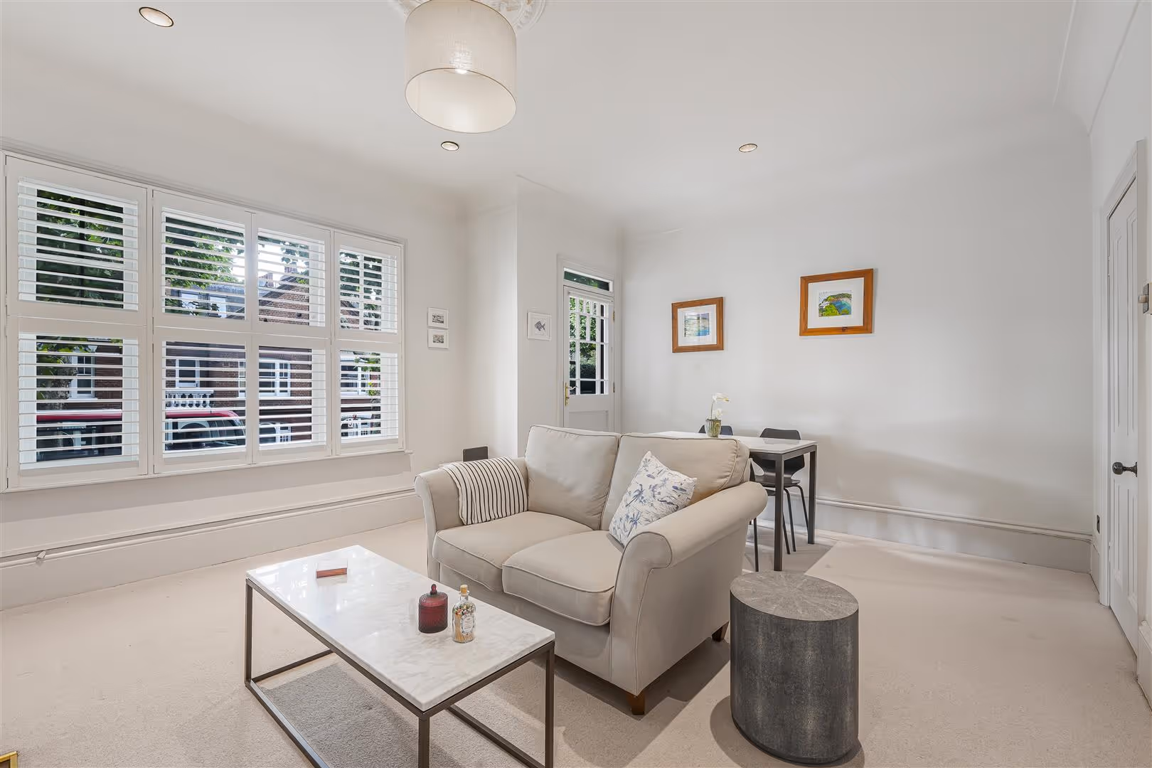 Upstairs, the principal double bedroom is situated at the rear and boasts built-in wardrobes and an attractive fireplace. A second spacious double bedroom and a sleek, contemporary family bathroom complete the upper level. The apartment also benefits from excellent storage throughout.